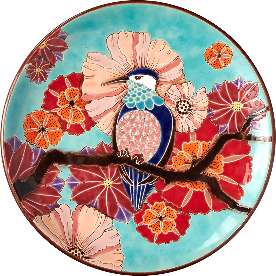 A completely handmade ceramic plate from the "Birds" series with floral motifs.