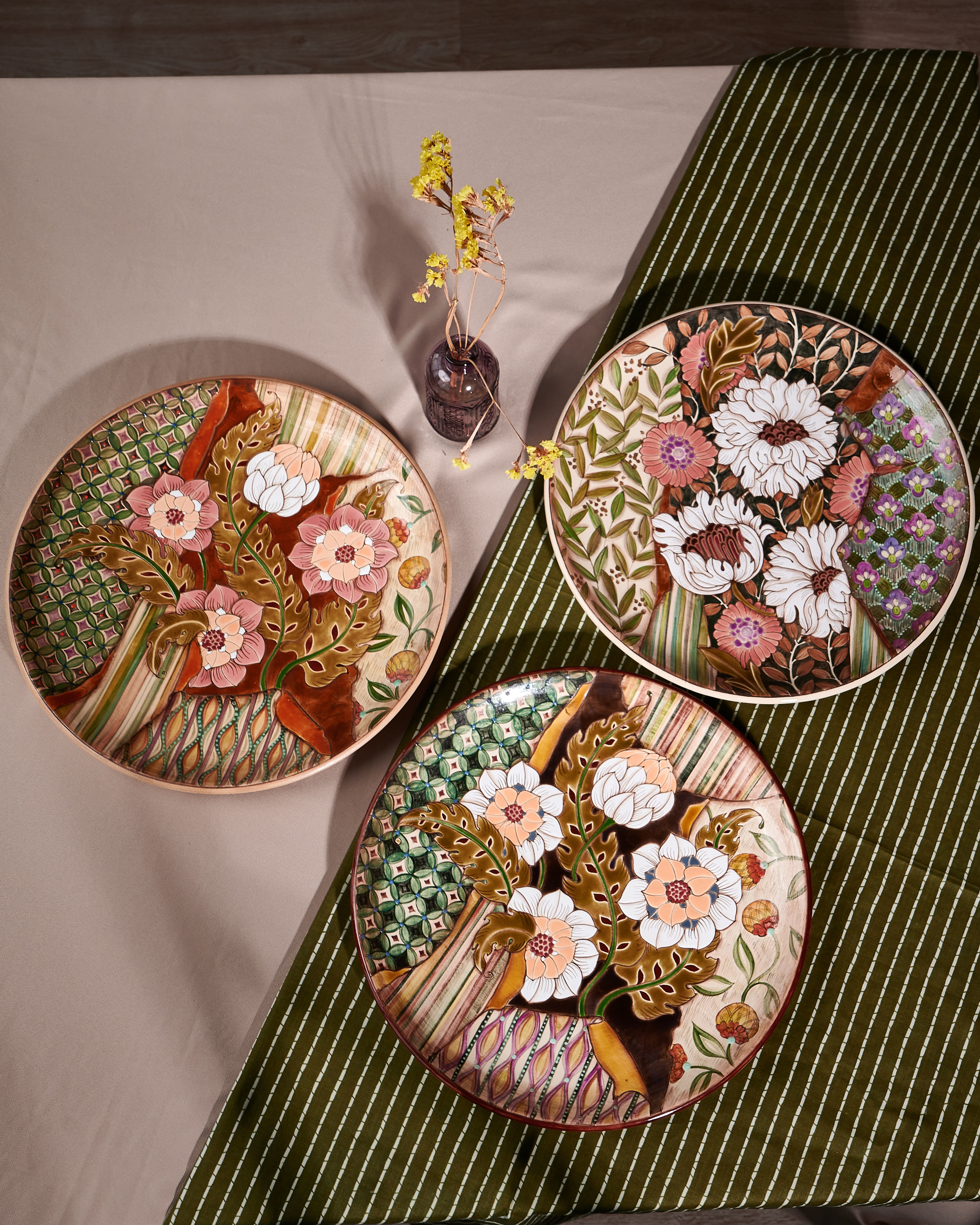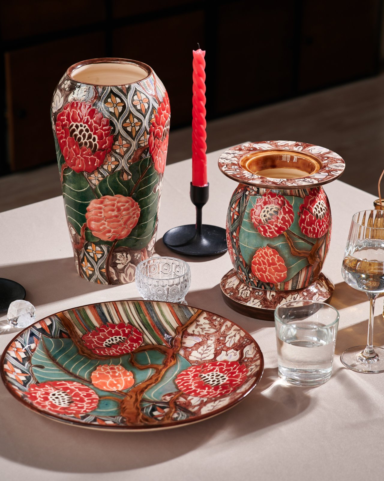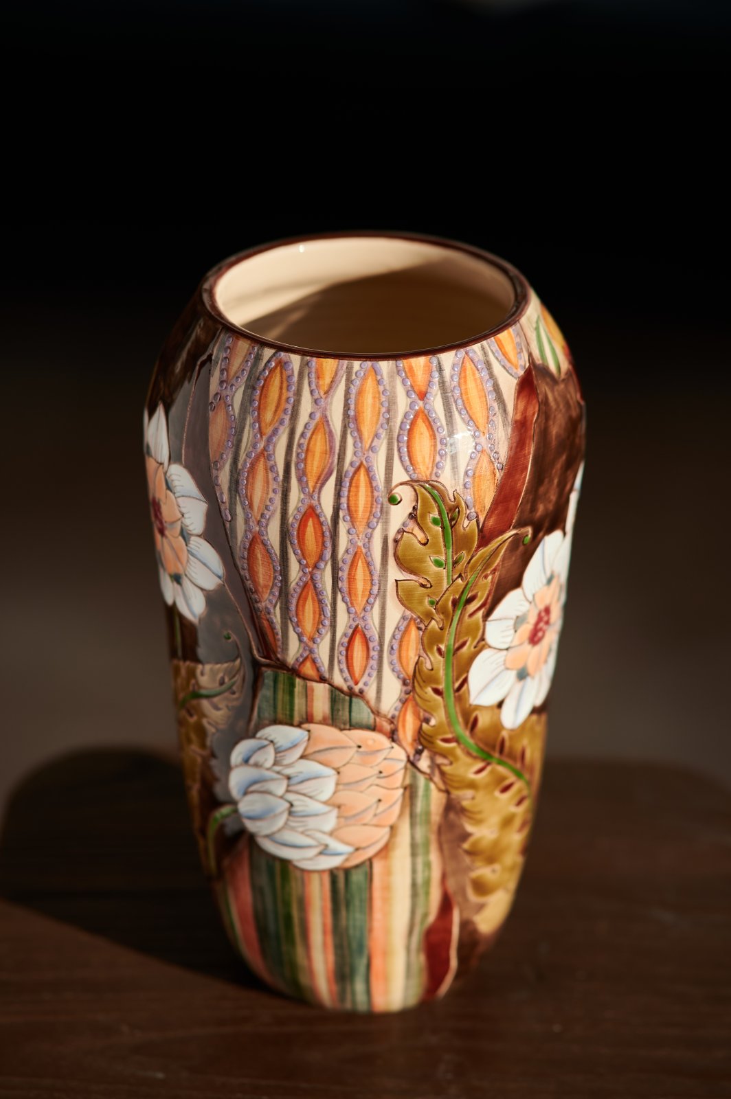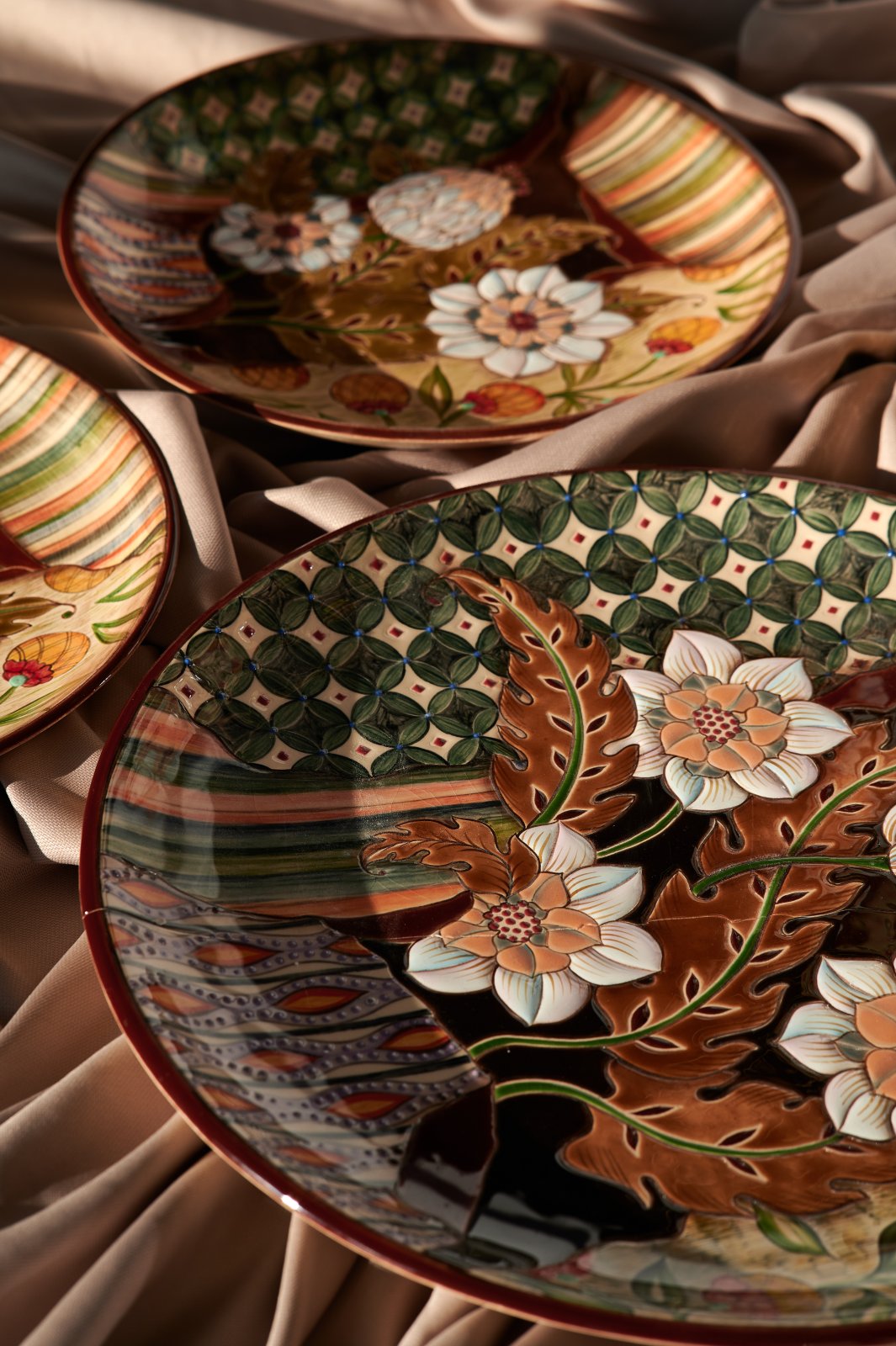 In my work, I combine underglaze painting, relief paste, glaze painting, and overglaze painting. In my case, overglaze painting emphasizes contours, details, and shadows. The other techniques create a multi-layered background, a watercolor effect, and interplay of textures and shades. The final design is embossed and shimmers in the sun with all its colors. This technique cannot be recreated by any machine or tool.